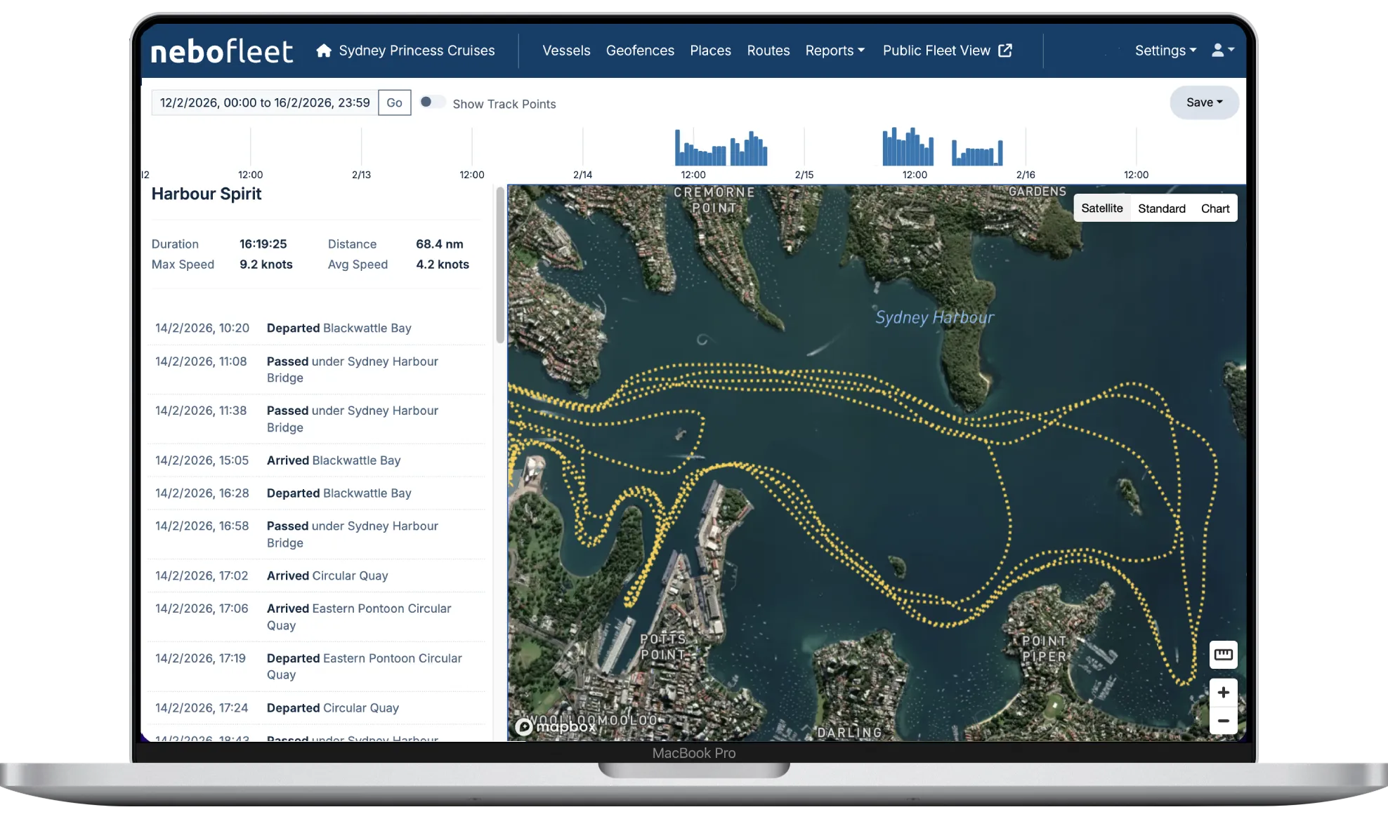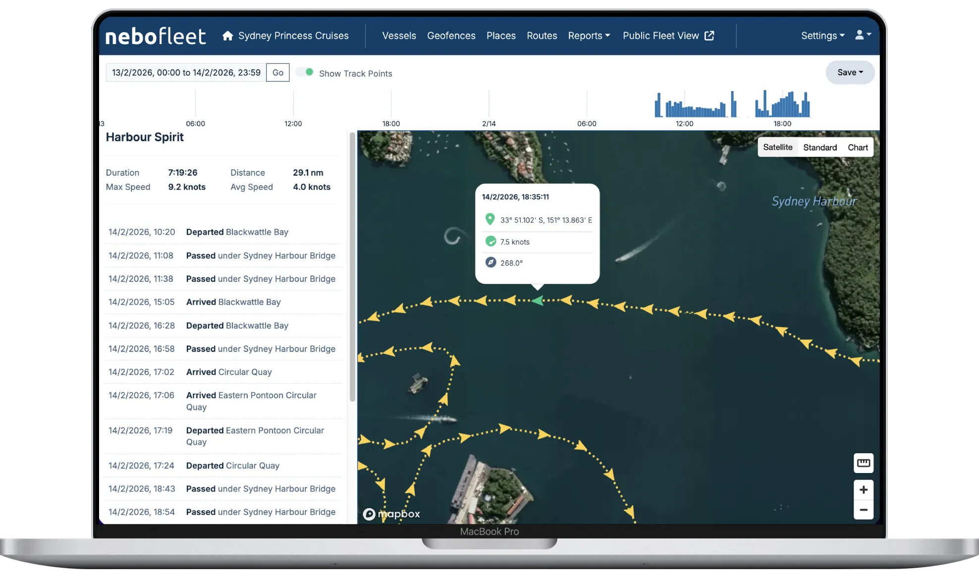With 30-second updates, Nebo Fleet provides unprecedented vessel tracking and voyage logging.